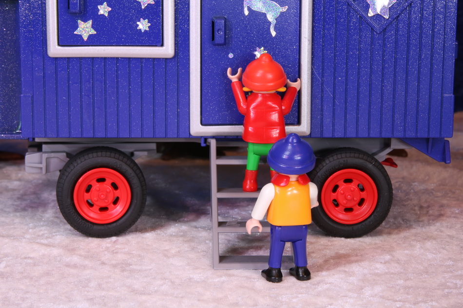 Kurze Zeit später stehen die beiden vor dem Weihnachtsmann-Wagen.