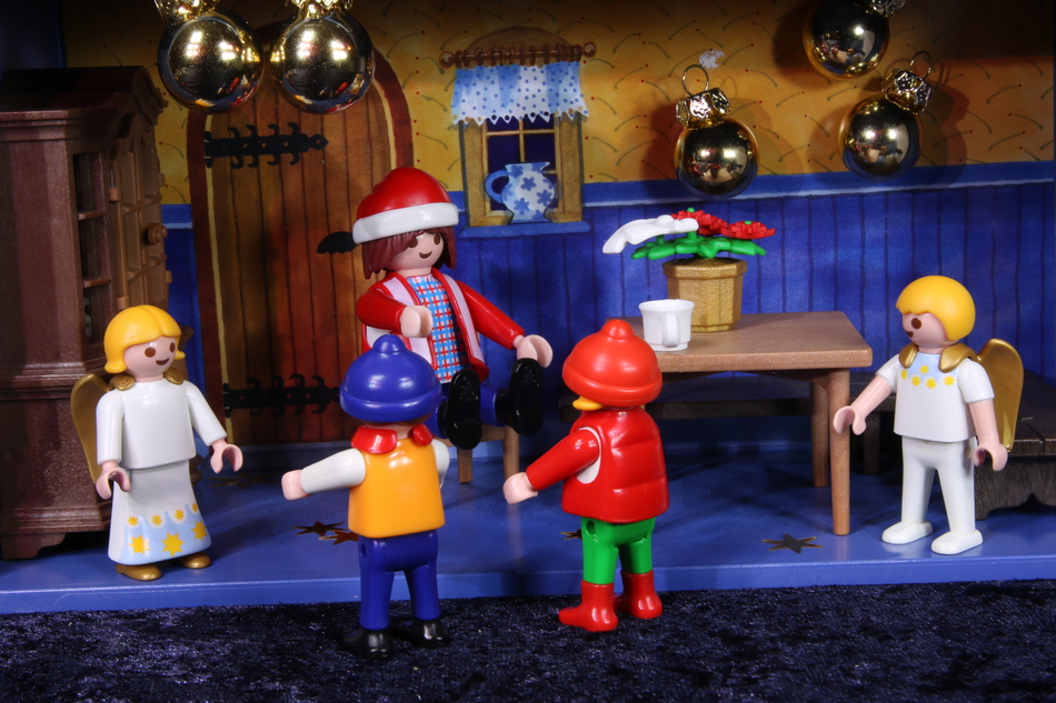 Emmanuel drängt: "Komm Julebukk, versteck dich in der Wichtelwerkstatt! Lass den Jungen öffnen." Damit zieht er den letzten, echten Weihnachtsmann mit sich zum Schrank.