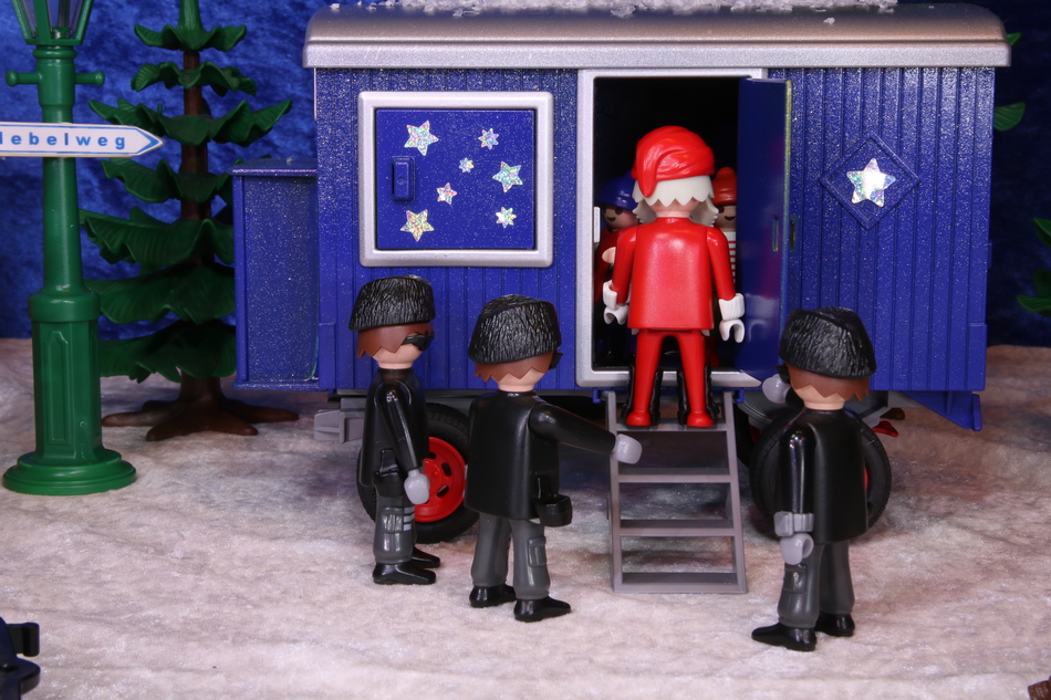 Draußen stehen ein verkleideter Weihnachtsmann und ein schwarz gekleideter Mann. Außerdem parkt dort ein silbergraues Auto mit einem Stern auf der Motorhaube. Darin sitzen ebenfalls noch Leute von Waldemar Wichteltod.