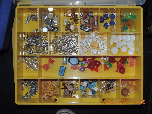 Zum Glück hat mein Vater irgendwann mal eine Menge Sortierkoffer angeschafft, von denen auch schon welche für die Loombands letztes Jahr benutzt wurden. die habe ich mir jetzt zurück erobert und nu habe ich 13 Stück davon, finde es gut das ich weiß"Ah für das Set brauche ich den Hut also ein blick in einen der drei Hut Koffer werfen," vorher hat man sämtlich Kisten durchgewühlt und war Std beschäftig um einzelne Kleinteile zusammen zutragen...