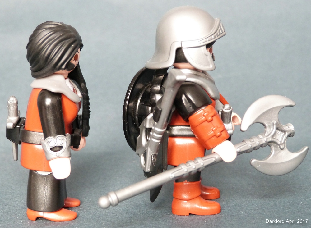 An der Zivilversion der Amazone auf dem ersten Bild möchte ich gar nichts verändern. Es geht um die Kriegerinnen-Version (wie oben beschrieben). Aufmalen von Knöpfen o.Ä. kommt bei mir absolut nicht in Frage! Da würde ich mehr verschlimmbessern als ich verbessern würde. Ich bewundere Customizer, denen es gelingt Teile so zu lackieren, dass man denkt es sei Original-Playmobil. Davon bin ich aber so weit entfernt, dass ich es erst gar nicht versuche. Bei meinen Amazonen habe ich - soweit ich das erinnere - nur ein einziges Mal zu Farbe gegriffen: Das war bei einer Pferdeschabracke, bei der das Wappen etwas anders aussah.