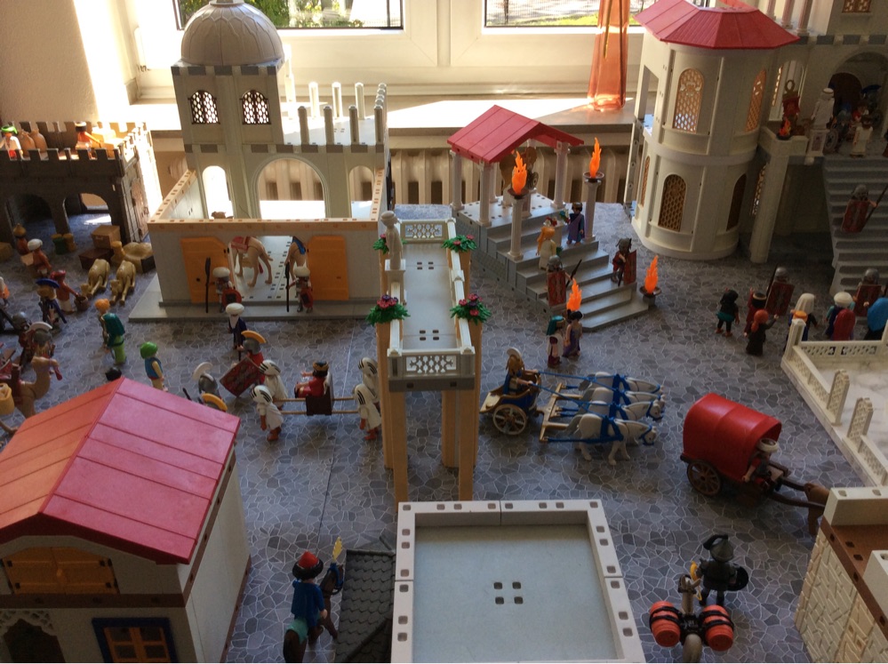 Anfangs war ich zögerlich, ob es mir gefallen wird. Ich stehe eigentlich nicht auf die System-X-Schlösser (habe auch keine) und konnte mir das nicht gut vorstellen. Jetzt zeigt sich, dass gerade diese Bauten ein schönes orientalisches Flair ergeben, schon wegen der runden Kuppeln. Besonders gelungen finde ich auch das viele Weiß. Ich hatte im vergangenen Jahr für das "Wimmelreich" versucht, graue Wände elfenbeinfarbig zu lackieren und es nach dem ersten Haus aufgegeben...