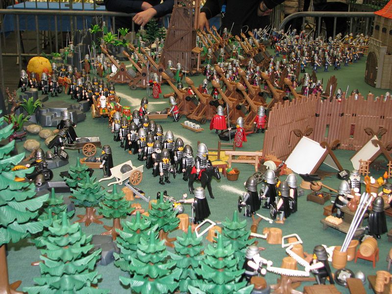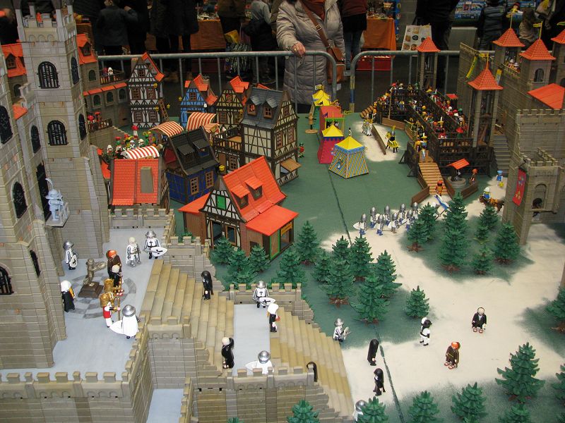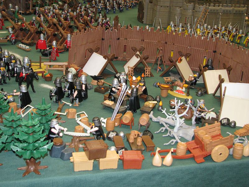 Interessant finde ich, dass das Diorama quasi zwei Seiten hat. Auf der einen Seite eine beginnende Schlacht, Armeen ziehen auf, und auf der anderen Seite friedliches Leben mit Markt und Ritterturnier.
