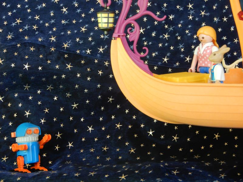 "Ach, das ist nicht so weit. Außerdem ist euer Schiff schnell", antwortet der Roboter.