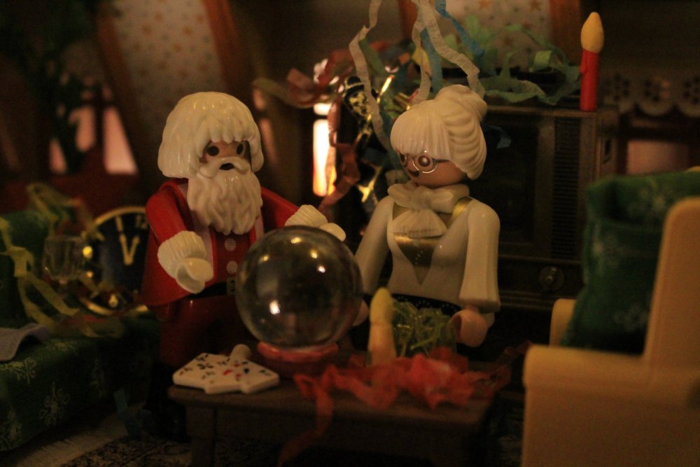 Herr und Frau Weihnachtsmann versuchen in die Zukunft schauen, um zu sehen was auf sie im neuen Jahr 2018 alles zukommt