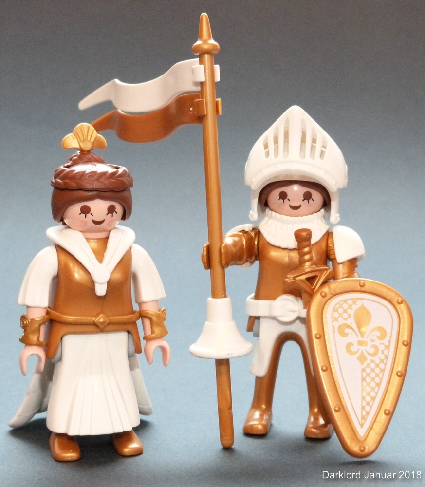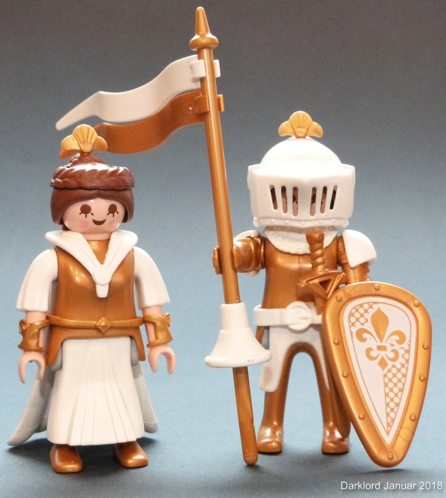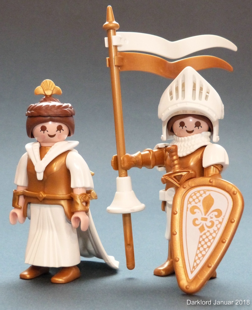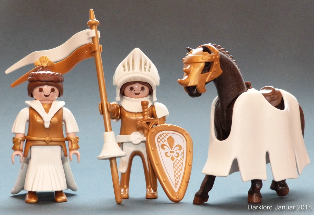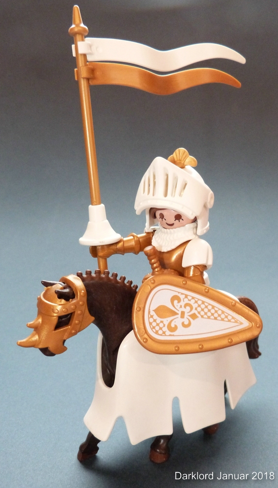 Als Alternative hätte ich noch ein Pferd der ältesten Generation mit goldenem "Einhorn-Kopfpanzer" und weißer Schabracke (ebenfalls erste Generation). Die Schabracke ist aber so vergilbt, dass ich sie erst mal in Danklorix eingelegt habe.