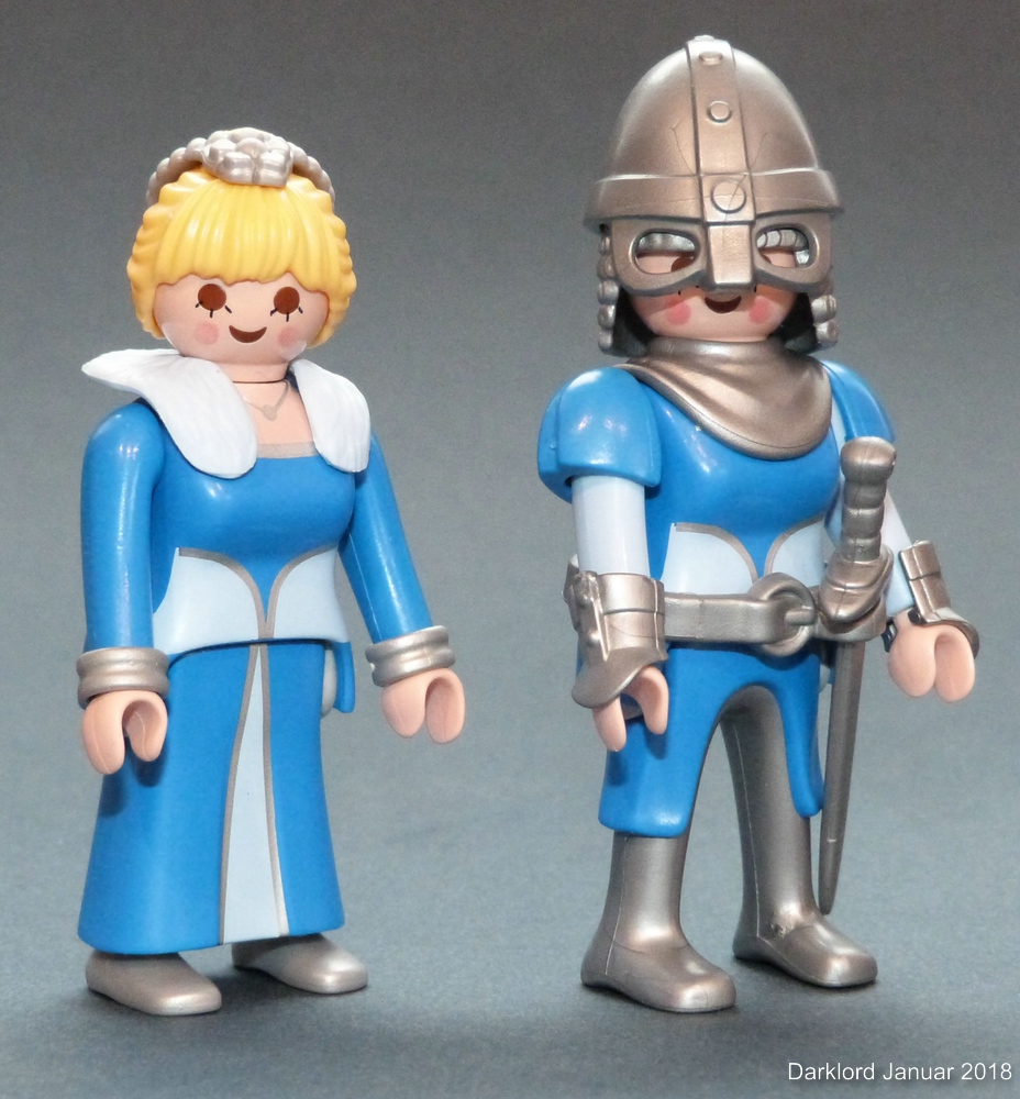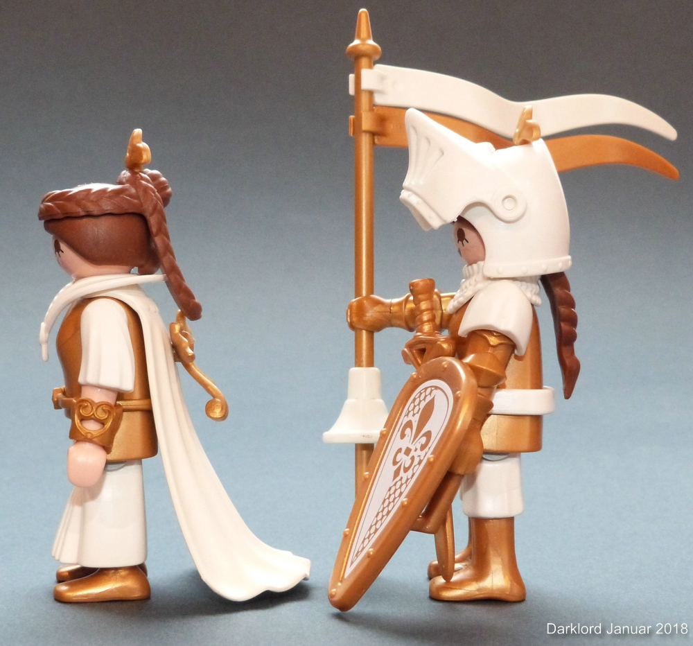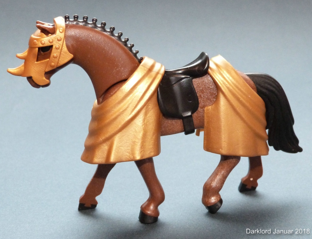 Besondere Probleme hat mir das Schlachtross gemacht, da es für die neueren Pferde keine schönen goldenen Kopfpanzer gibt (nur den einen in diesem doofen extrem glänzenden Goldton, der zu nix anderem passt). Der hier verwendete Kopfpanzer stammt aus dem Dragons-Tütchen 5464. Ich habe mich schon immer gewundert, warum dieser Echsen-Kopfpanzer Löcher für Ohren hat. Er passt praktisch auf keinen Pferdekopf. Das hier verwendete Pferd war das einzige, an dem er leidlich passte. Mit ein wenig dremeln und föhnen habe ich ihn dann vollständig passend gemacht.