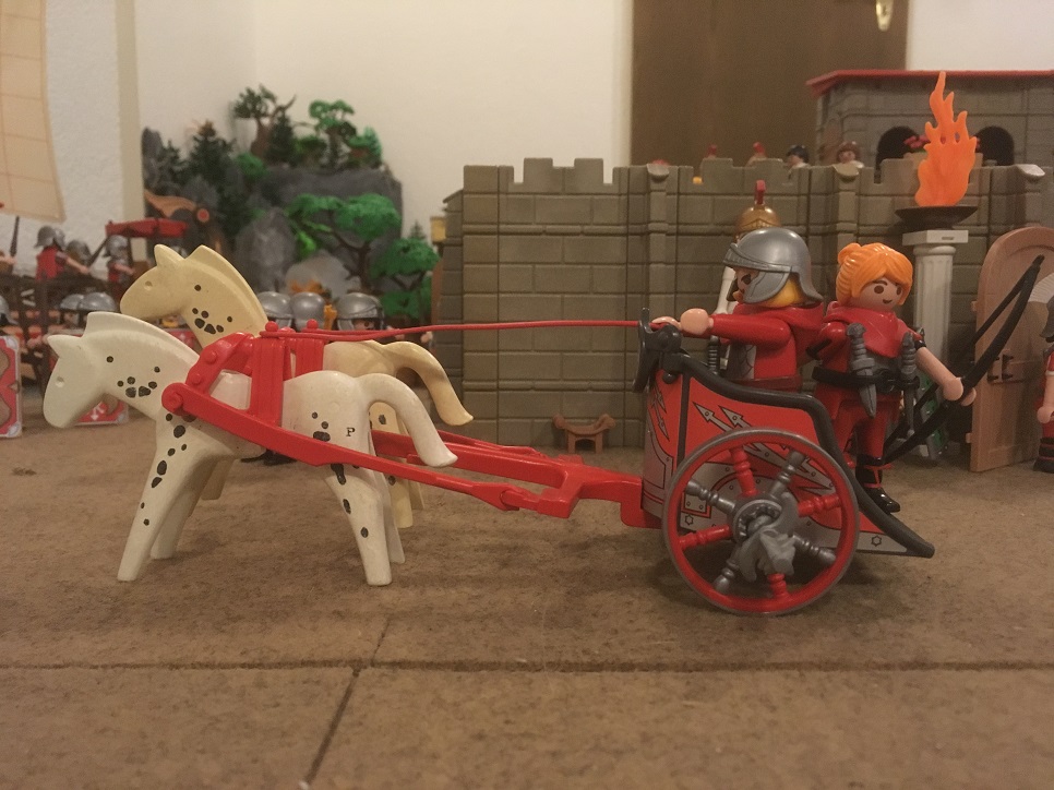 Auf der Strasse kommt ein Kurier im Doppelspänner - dem passt die von Legionären volle Strasse so gar nicht, gegenüber dem Centurio wagt er aber nicht sich aufzuspielen!