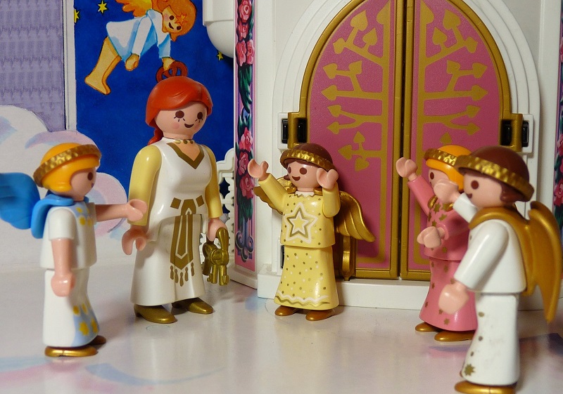 Und als nun die Jungfrau Maria weg war, fing sie an und besah die Wohnungen des Himmelreichs: jeden Tag schloss es eine auf, bis die zwölfe herum waren. In jeder aber war ein, von großem Glanz umgebener Apostel, und es freute sich über all die Pracht und Herrlichkeit, und die Englein, die es immer begleiteten, freuten sich mit ihm.