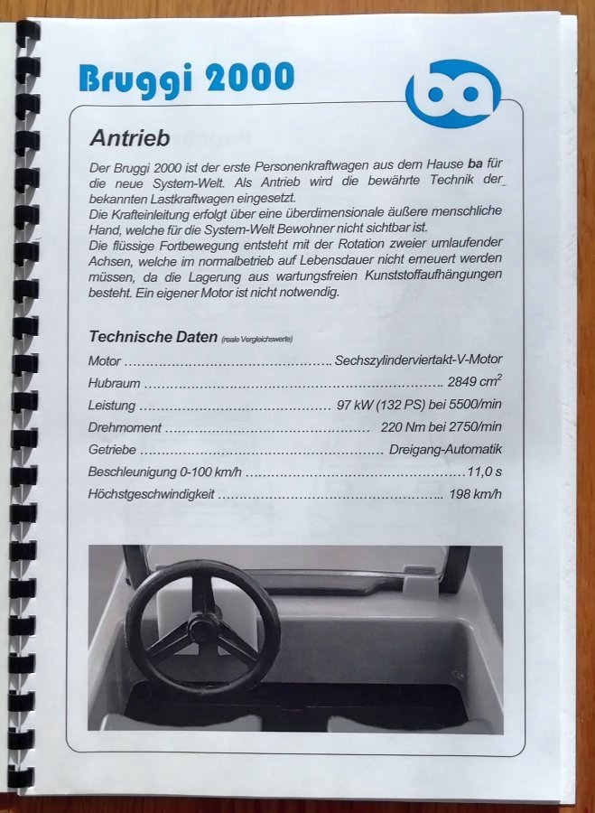 Und eine Motorisierung, die so manchen zeitgenössischen Benz in den Schatten stellt! Ich hätte ja eher die stolzen 1,1 Liter Hubraum mit zornigen 50 PS aus Papis damaligem Golf 1 erwartet - gibt es vom Bruggi 2000 keine Familien-Sparversion?
