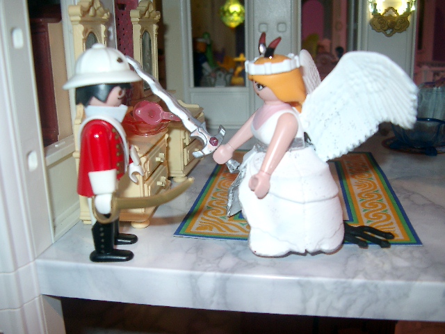 „Hey! Wir haben uns doch auf Frieden geeinigt, also wo ist das Problem wenn ich eine Hälfte des Schlosses bekomme?“ „Vergiss es! Die Antwort lautet immer noch nein! Du denkst doch nicht ernsthaft, wir zwei könnten unter einem Dach leben…“