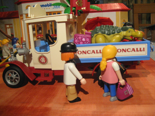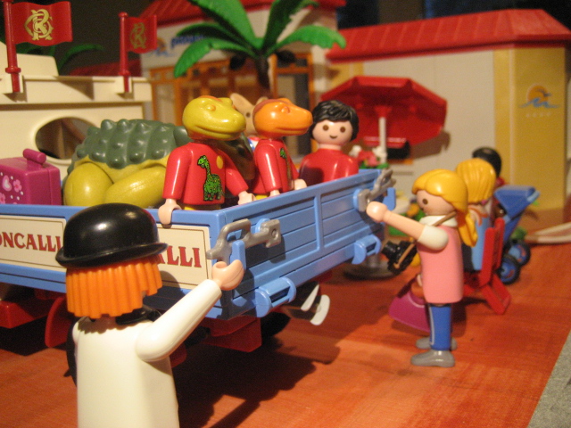 Der Clown will den Dinos von der Ladefläche helfen - aber da ist Knuffel schon heruntergesprungen.