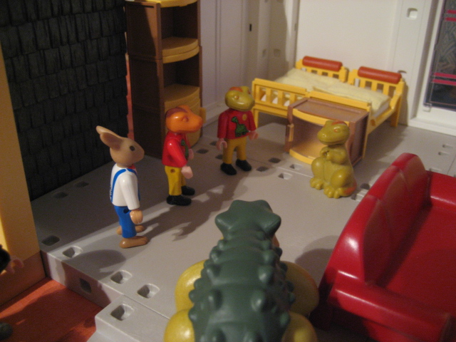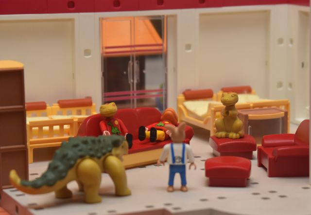 Später gehen wir wieder zu den drei Dinos ins Hotelzimmer. Sie sitzen noch immer gelangweilt herum.
