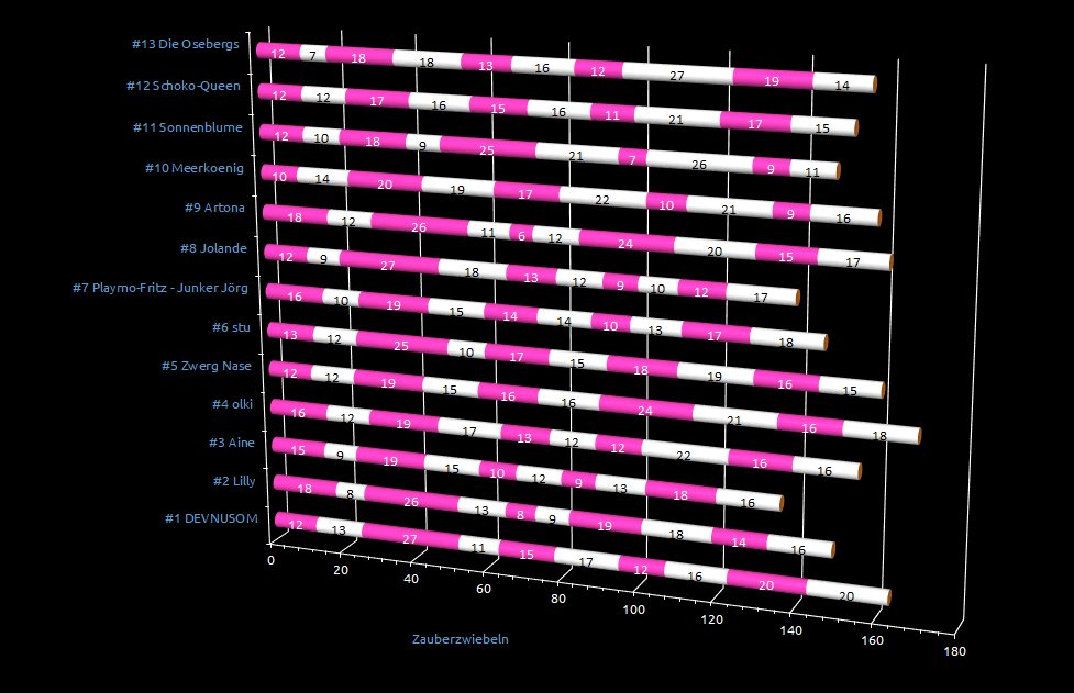 Die № 12 war Igor: Erst eine . Noch war ich zuversichtlich: Igor schlägt Halſbänder mit Bommeln vor: Die sind ſchick und halten Fliegen fern ... Eine = ⊕2 ZZ für Igor. Die = Weitergebommelt von FELD 2. [Zitat Flatterfee] = eine Marketing-Strategie war gefragt. Bei dem Wort dance battle wurde ich hellhörig. Dance battle mit Zombieſ und Ghulſ. ſchick und cool = Igor hatte ⊕3 ZZ eingesargt. Nailed it! [Zitat Flatterfee]. Mea culpa, mea culpa, mea maxima culpa […] Nach einer warf ich das Stichwort Klappspaten in den Chat und schon marschierte der kleine Wutzi-Putzi los: Mit dem Klappſpaten hob Igor eine Erdgrube aus und erlegte waidgerecht kurzerhand unseren Küchenchef Rüpelstilzchen ... Weitere Zutaten zu dem Rüpelſteak aus dem Erdofen: [Gift]Pilze, Mumienſtaub, Motten, diverſe Nachtſchattengewächse, darunter Tollkirſchen und fette, ſaftige Würmer. uAAAh! Bon[e] appétit! Ich hab da 'mal 'ne Frage: Wenn du das Rüpelstilzchen zur Strecke gebracht hast, Igor, wie wolltest du dann Zauberzwiebeln von ihm erhalten? Nein, es sei denn ...3 ZZ für Igor. ;-) Guten Hunger! [Zitat Aine] Die bereitete dem Spuk ein Ende? In der Summe: 14 ZZ für Die Osebergs. Selbst den Hartgesottenen [!] unter uns lag längstens jetzt ein Rüpelstilzchen quer. *rülpsel*