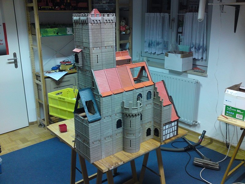 eigentlich kennst Du ihn ja schon... war damals in WOB genau so (nur mit den gelben Puppenhausteilen). Der Palas sieht am wenigsten "echt" aus. Aber ich habe keine andere, sinnvolle Lösung gefunden, den grundsätzlich etwas größeren Baustil des Gebäudes mit Playmobil umzusetzen, ohne mir einen Elch zu dremeln. Ich hatte mal erwogen, es nach der "Methode Stu" zumindest mit einer verblendeten Fassade aus Trittschalldämmung zu probieren. Doch nachdem ich jetzt erstmal drei Wochen Kranksein aufholen muß, ist daran nicht zu denken. Es ist wie mit Mauer auf Fachwerk... dem Profi wird's auffallen (und er wird viele Ideen haben, wie man es anders machen kann - die lese ich auch grundsätzlich gerne). Aber für das Gros der Leute zählt ein Gesamteindruck ohne solche Details - wage ich einfach mal zu behaupten. Und für meinen Predigtaufhänger am Reformationstag sowieso...