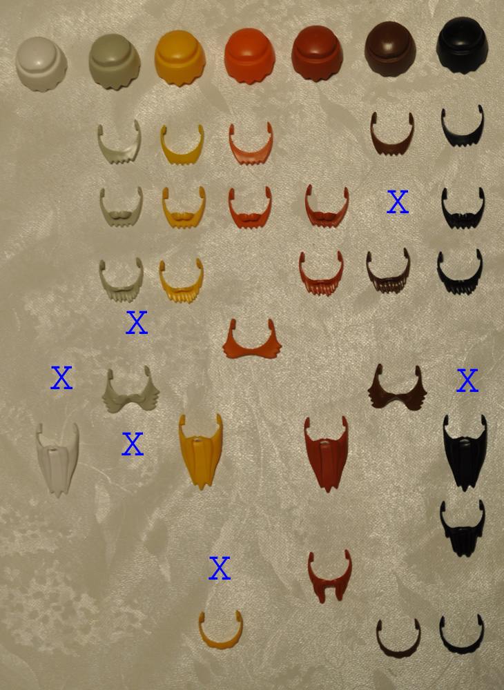 Es fehlen der aktuelle Weihnnachtsmannbart, der Piratenbart mit Zöpfen, der Backenbart, der lila Zackenbart mit Zackenfrisur, ansonsten sollten alle Zackenfrisurfarben berücksichtigt sein. Jedes X ist ein Bart dessen Träger beim Phototermin nicht den Weg aus seiner Schachtel gefunden hat, fehlt noch was???