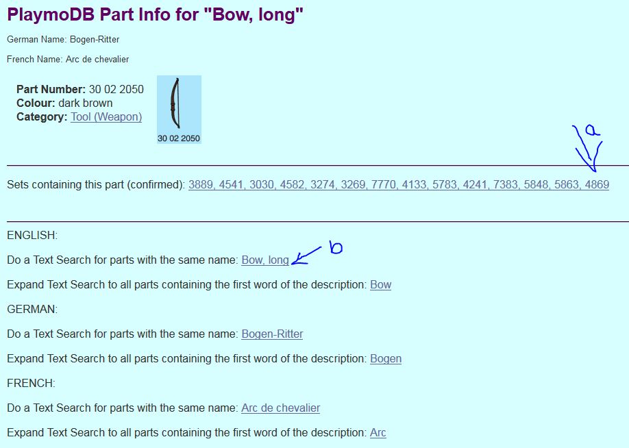 http://playmodb.org/cgi-bin/textsearch. ... m&lang=all http://playmodb.org/cgi-bin/showpart.pl ... 30-02-2050 Klicke ich auf "a" = 4stellige Setnummer: Klicke ich auf "b" = Stichwort Mit "Show pictures" bekomme ich zu den 8-stelligen Nummern Bider gezeigt Wir haben hier noch einen wertvollen Link, wie du herausfinden kannst, ob das Ersatzteil verfügbar ist: