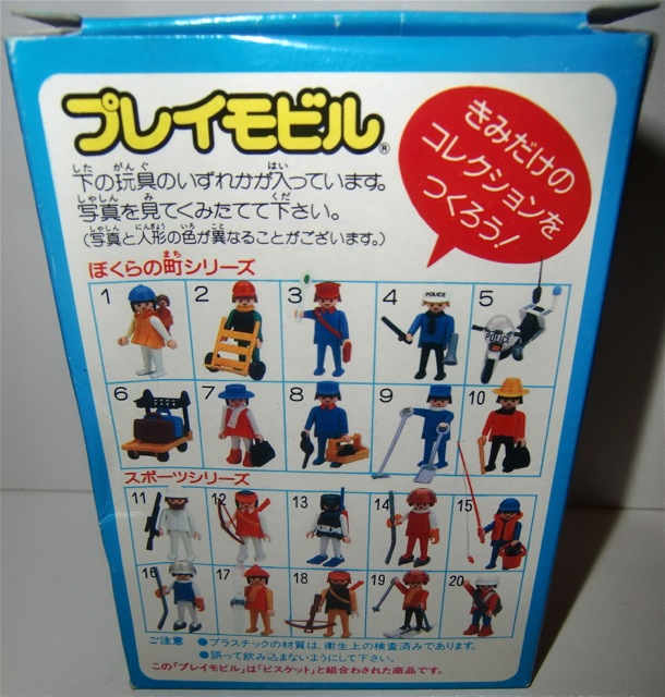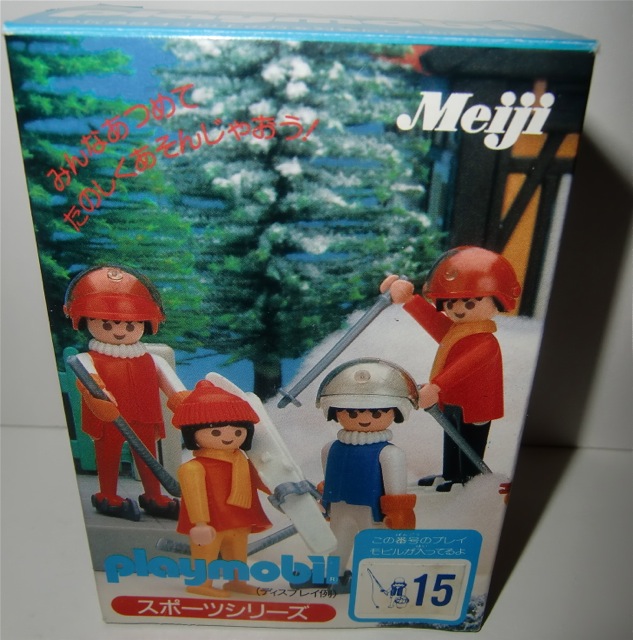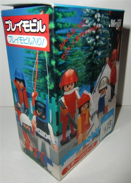 Nach mehr als 15 Jahren intensiv sammeln habe ich jetzt eine respektabelen Meiji Sammlung aufgebaut. Die gehören zu meine Lieblings Sets da die Verpackungen vom Design sehr original sind und die Szene auf die Vorderseite auf die beide Seiten weiter geht (Verzeihung, ich weiss nicht gut wie ich das umschreiben muss). Es gab fast immer 20 verschiedene Sets in eine Serie und ein Aufkleber auf der Vorderseite zeigte welche Figur/Set da drin war. Es muss ungefähr 7 oder 8 verschiedene Serien gegeben habe. Ich vermute die erste Serie hat so in 1983/84 angefangen und die waren nur in Japanische Supermarkten zu kaufen (damals schon relativ teuer). Die Playmobil Verpackungen waren zusammen mit eine Meiji Keksen/Chokolade Verpackung verschweisst. Leider habe ich nur eine von diese Keksen Verpackung in meiner Sammlung (die rote Box auf die untere Reihe mit diese "Smiling Faces" Keksen). Die Verpackung ist noch ungeöffnet und ich will gar nicht wissen welche Farbe die Keksen jetzt haben.