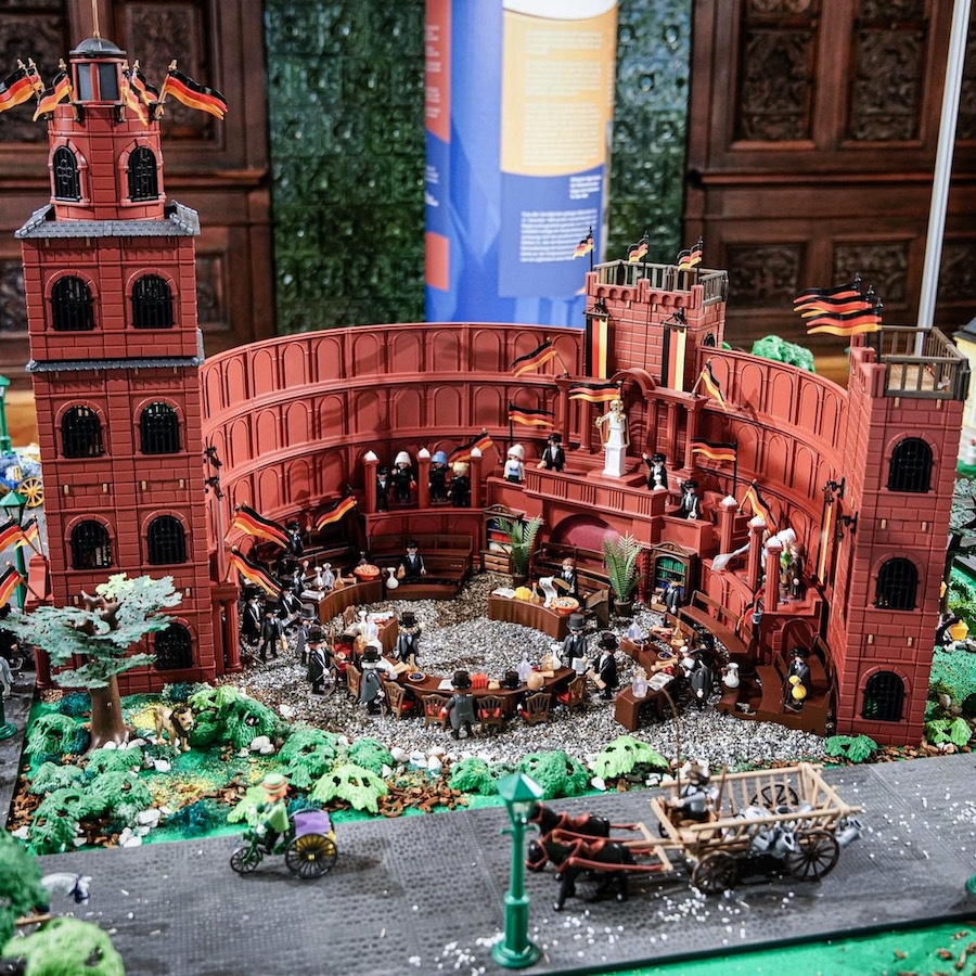 Besonders gelungen ist die Paulskirche: die Mischung aus Kolosseum und Stecksystem und nicht zuletzt die Sandsteinfarbe (dabei fällt mir erst auf, wie sehr die Farbe im Original Playmo fehlt).